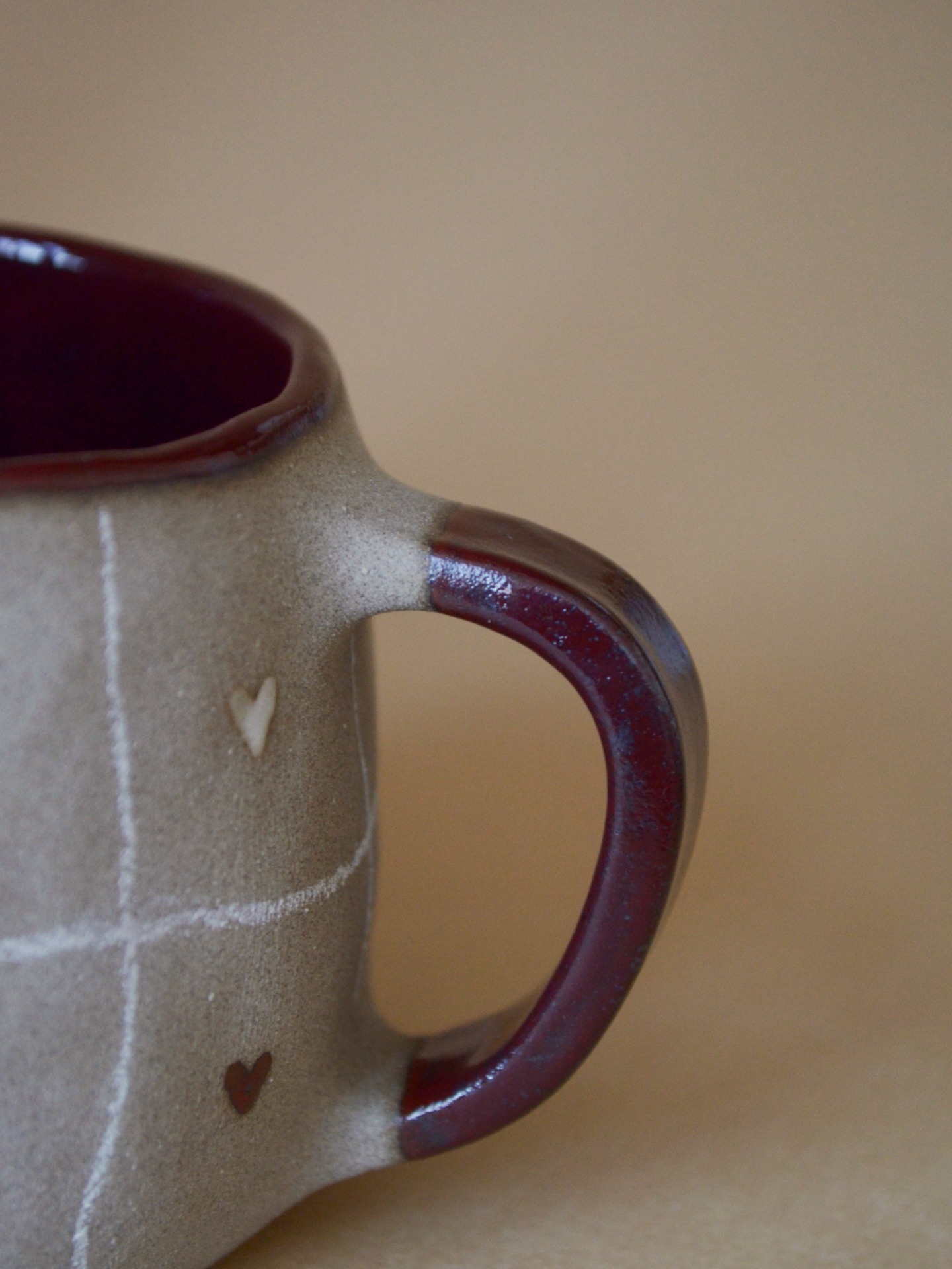 Jemné káro a drobná srdíčka, čistota neglazované hlíny v kontrastu s tajemnou burgundy uvnitř. To je Srdcovka - nechte si ji pro sebe, nebo darujte jako malou radost od srdce.