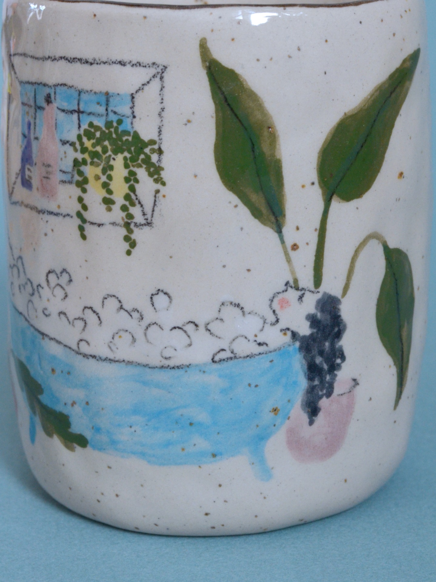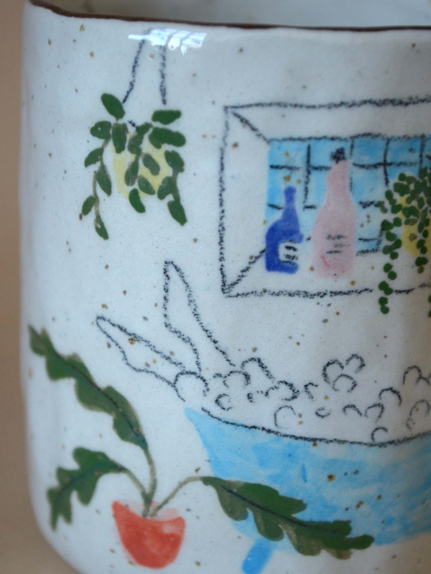 • z tečkované krémové kameniny, pomalovaný podglazurními barvami a pastelkam a zalitý do průhledné glazury