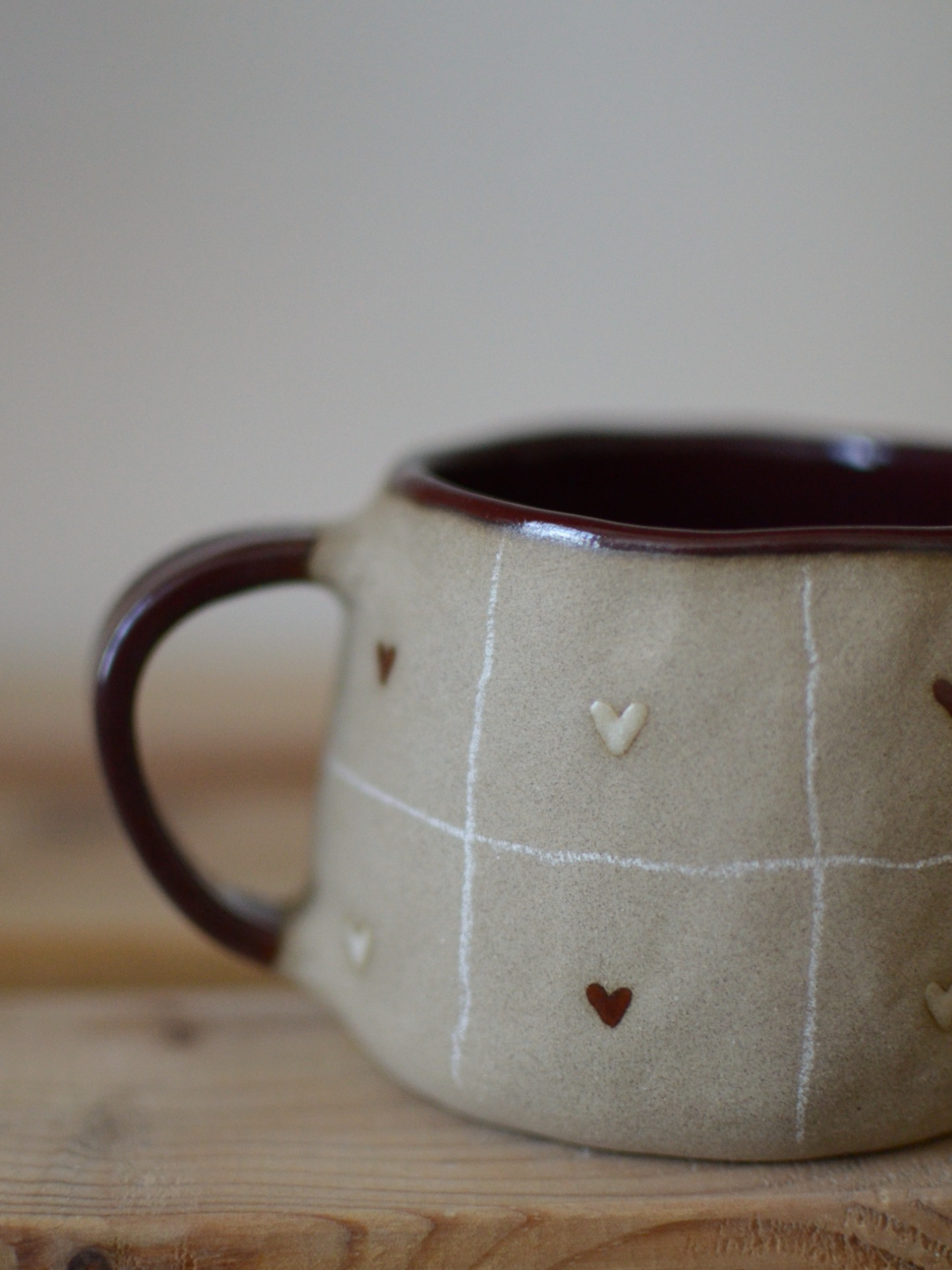 Delicate checks and tiny hearts, the purity of unglazed clay contrasting with a mysterious burgundy interior. This is the Heart piece —keep it for yourself or give it as a little gift from the heart.