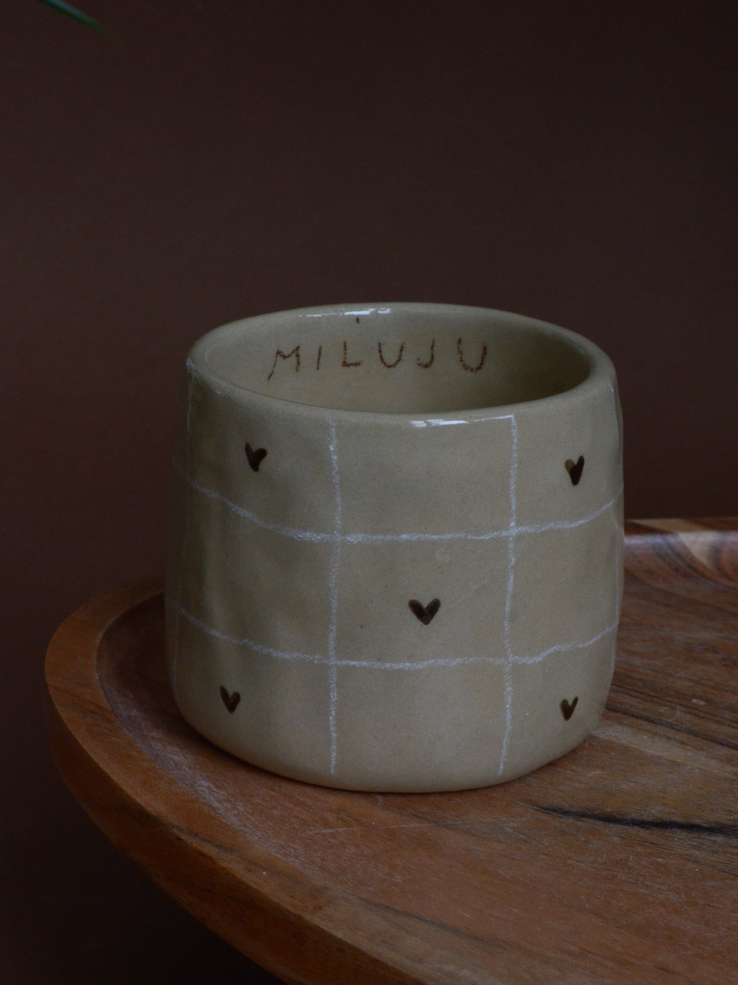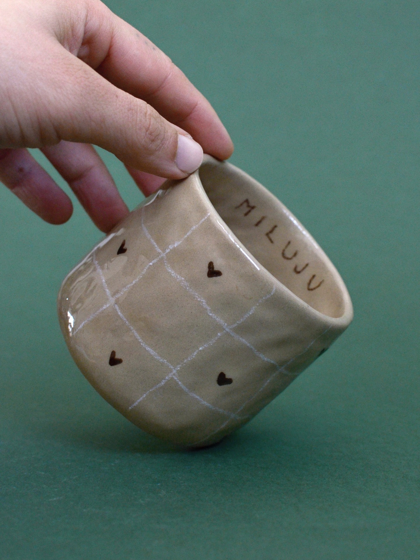 Hand-pinched cup with an inscription inside