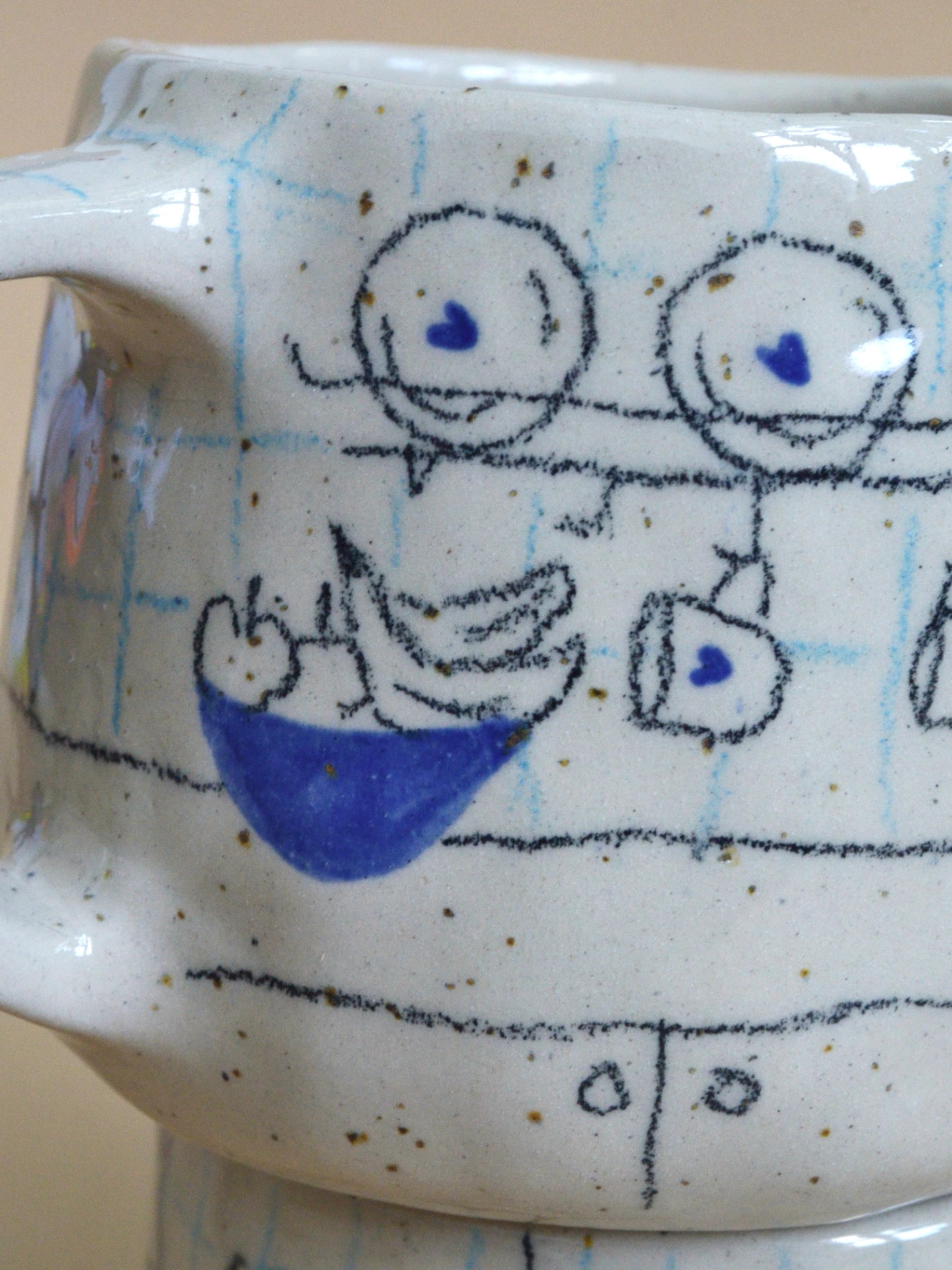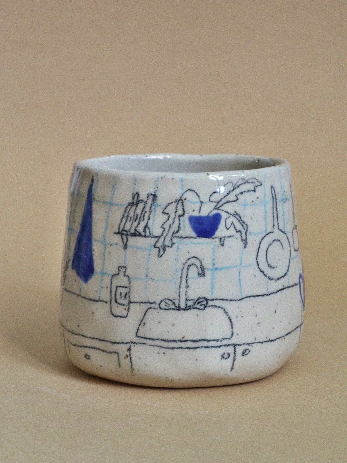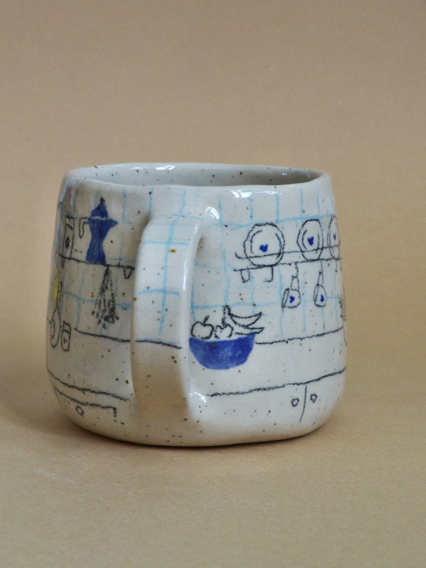 Made from speckled cream stoneware, decorated with underglaze pencils, and finished with a clear glaze.