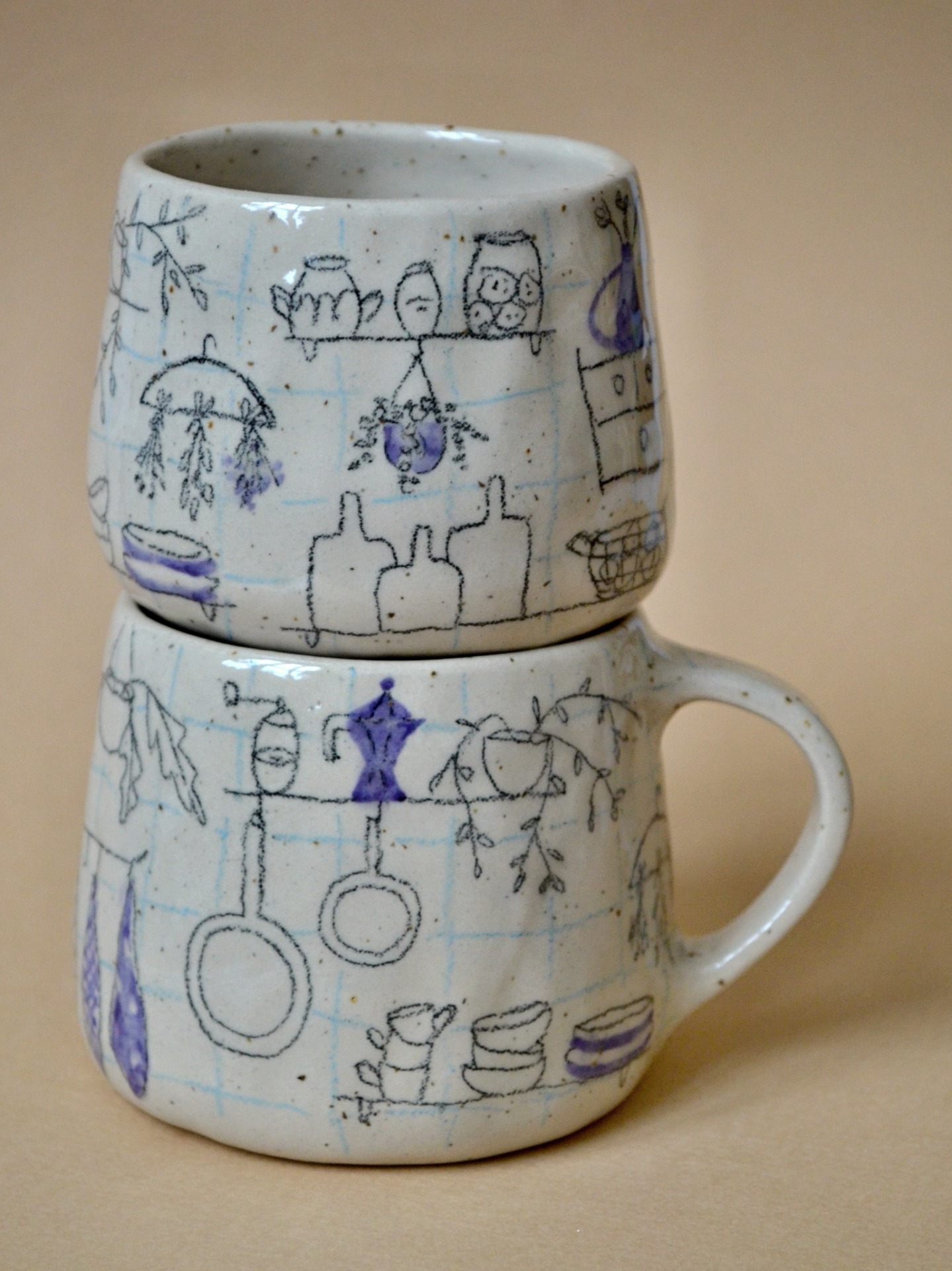 - z tečkované krémové kameniny, pokreslený podglazurními pastelkam a zalitý do průhledné glazury